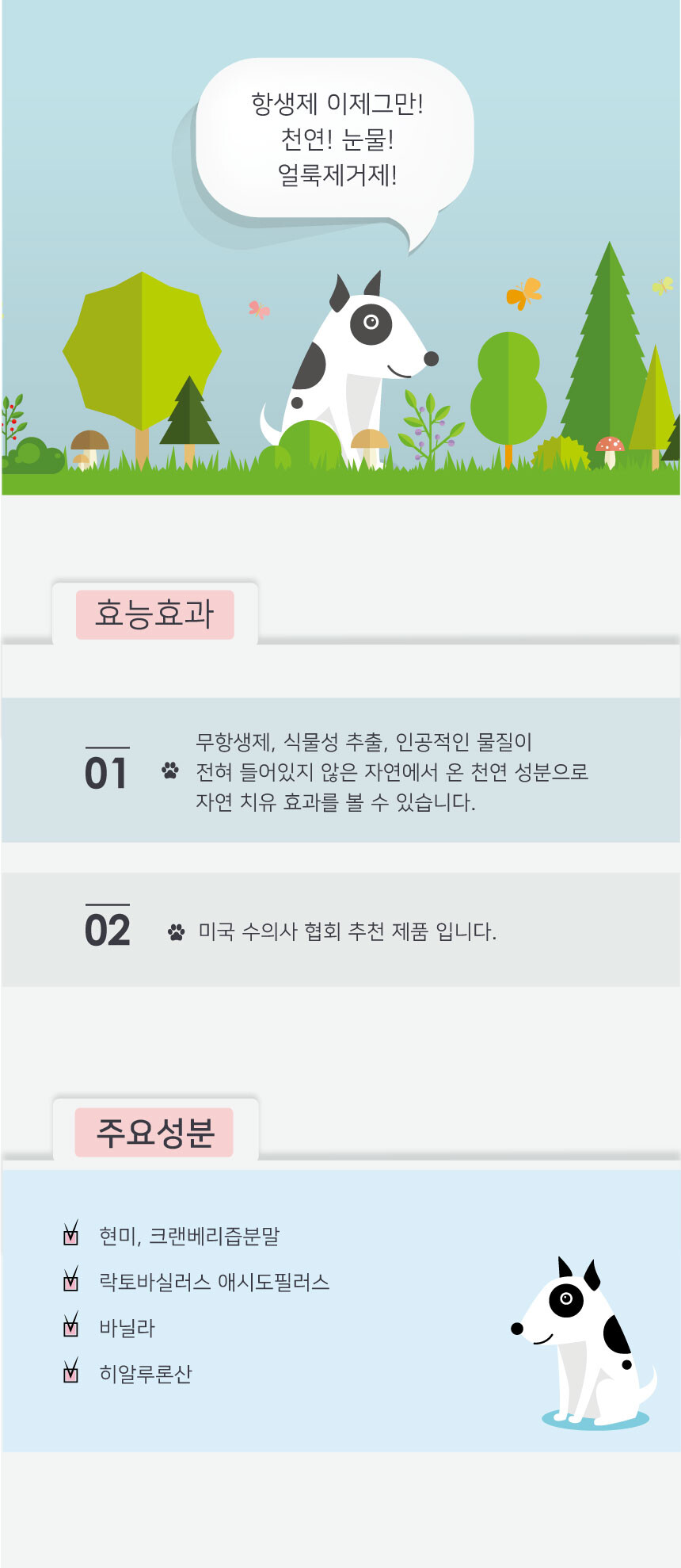 천연 원료로 인하여 화학물질에 반감을 갖는 반려견들에게 효과적입니다.