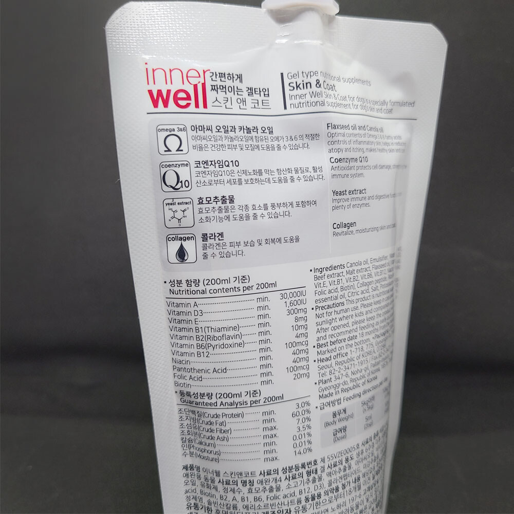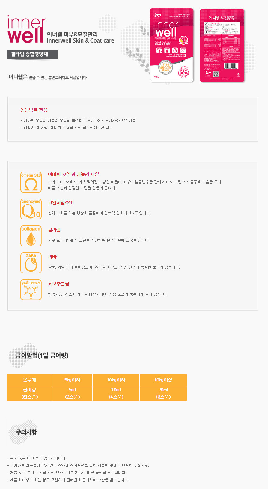 이너웰은 이런 기능이 있어요 식물성오메가3 함유로 아토피 알러지 개선 코엔자임Q10 항산화 기능 콜라겐으로 피부 보습 가바(쌀배아) 심신 안정 및 분리불안 감소 효과